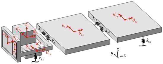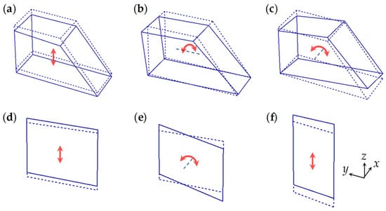 First, as shown in Figure 7a–c, the vibration modes dominating the behavior of the powertrain in the low-frequency region are the bounce, pitch, and roll modes. Accordingly, three degrees of freedom are accorded to the rigid-body motion of the powertrain, and the generalized coordinates for the bounce, pitch, and roll motions are expressed as , , and , respectively. As depicted in Figure 7d,e, the radiator exhibits bounce and roll modes in the low-frequency region; therefore, the generalized coordinates and for the bounce and roll motions are respectively assigned to the radiator. Similarly, the intercooler possesses a bounce mode solely in the low-frequency region (refer to Figure 7f); thus, the generalized coordinate for the bounce motion is assigned to the intercooler.