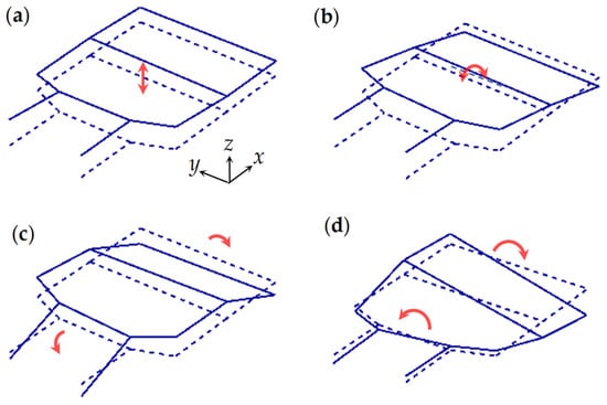 Conversely, the body floor features rigid-body modes such as bounce and pitch modes (refer to Figure 8a,b) as well as flexible modes owing to the bending and torsional deformations (refer to Figure 8c,d) in the low-frequency region. Therefore, both the rigid-body and flexible modes should be considered for the dynamic modeling. Considering these two modes, this study proposes a body floor model comprising three parts: the front, middle, and rear floors, as represented in Figure 9. The motion of the front floor is described with the generalized coordinates for the bounce, pitch, and roll motions (respectively denoted by , , and ), the motion of the middle floor is described with the coordinates for the pitch and roll motions (respectively denoted by and ), and the motion of the rear floor is described with the coordinates for pitch and roll motions (respectively denoted by and ). Degrees of freedom were not imposed on the bounce motions of the middle and rear floors because the midpoint of the interface between the front and middle floors and the midpoint of the interface between the middle and rear floors were assumed to be constrained by revolute joints.
