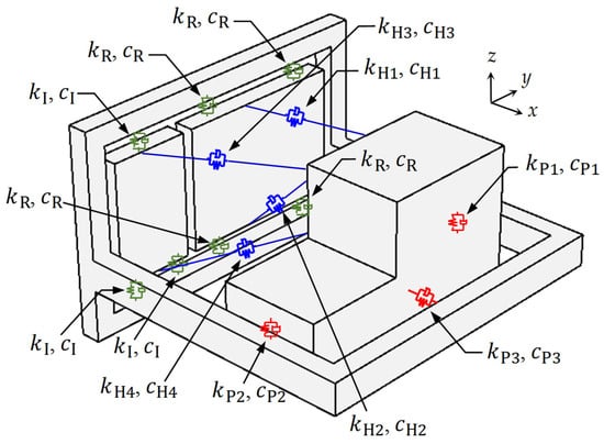 In addition, to establish the dynamic model, the stiffness and damping properties related to the radiator, intercooler, powertrain, and floors should be evaluated. As discussed earlier, the radiator is connected to the front floor via four rubber bushings, and the intercooler is connected to the front floor via three rubber bushings. The radiator and the intercooler are each connected to the powertrain through two rubber hoses. Moreover, the powertrain is supported at three positions by the engine, transmission, and roll mounts. The equivalent springs and dampers of these mounts, bushings and hoses are displayed in Figure 10. The equivalent stiffness and damping coefficient of the radiator rubber bushing are respectively denoted by and , and the stiffness and damping coefficient of the intercooler rubber bushing are respectively represented by and . The upper radiator hose exhibits a stiffness of and damping coefficient of , whereas the lower radiator hose possesses a stiffness of and damping coefficient of . Similarly, the upper intercooler hose demonstrates a stiffness of and damping coefficient , whereas the lower intercooler hose exhibits a stiffness of and damping coefficient of . Finally, the stiffness and damping coefficient are respectively denoted by and for the engine mount, by and for the transmission mount, and by and for the roll mount.