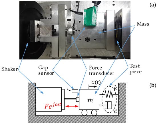 Measurement setup of the stiffnesses and damping coefficients for mounts, rubber bushings, and hoses: (a) the photo of actual device and (b) the corresponding physical model.
