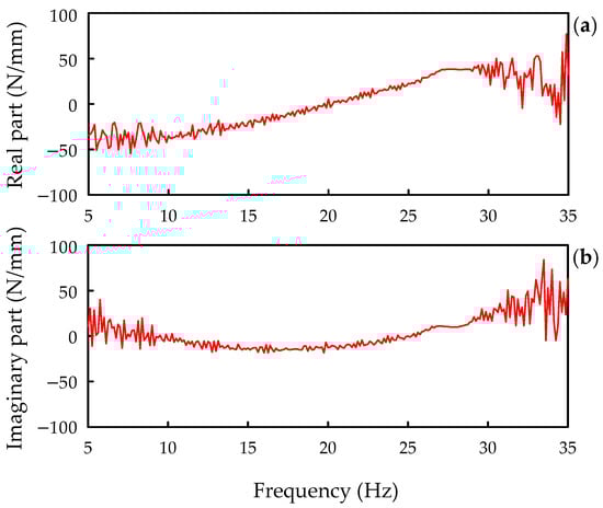 Considering the real and imaginary parts of the experimentally obtained dynamic stiffness, which are denoted by and , respectively, the stiffness and damping coefficient for the specimen can be obtained as follows: