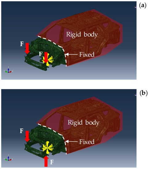 The equivalent bending and torsional stiffnesses between the front, middle, and rear body floors were obtained using a commercial package for finite element analysis. The process of obtaining equivalent stiffness between the front and middle body floors are described herein. As shown in Figure 13, the front body floor was discretized into finite elements with the commercial package, and the middle and rear floors were modeled as stationary rigid bodies. The boundary between the front and middle body floors was considered to be fixed. The load conditions for obtaining the equivalent bending and torsional stiffnesses between the front and middle floors are displayed in Figure 13a,b, respectively. To determine the bending stiffness, as shown in Figure 13a, uniform vertical forces of N were applied to both ends of the front-end module in the same direction. In addition, to determine the torsional stiffness, as illustrated in Figure 13b, vertical forces in opposite directions were applied at both ends. The deflections at the front corner of the front-end module for the load conditions, which are depicted in Figure 13a,b, obtained from the finite element analysis are 5.7 and 0.85 mm, respectively.