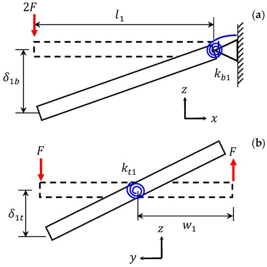To determine the equivalent stiffnesses, the rigid front body floor illustrated in Figure 9 has been schematically redrawn in Figure 14, wherein Figure 14a features the side view of the SUV, and its front view is displayed in Figure 14b. As depicted in this figure, the force, , is the same force of 10 N that was imposed in the finite element analysis, and and denote the length of the front floor (907 mm) and the half-width of the vehicle (428.5 mm), respectively. In Figure 14, and respectively symbolize the bending and torsional stiffnesses between the front and middle floors, which are identical to those represented in Figure 9, and and respectively denote the bending and torsional deflections. From the free-body diagrams in Figure 14, the bending and torsional stiffnesses are obtained as
