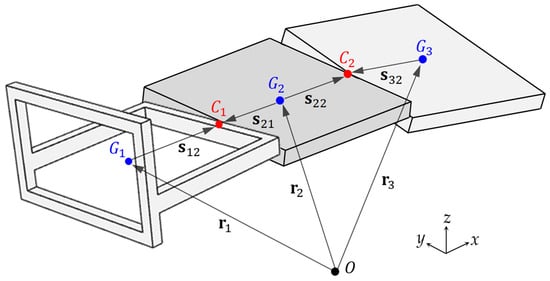 The constraints between the front, middle, and rear body floors were analyzed. As discussed earlier, the 19 coordinates are not independent of each other and only 13 coordinates are independent; thus, the proposed dynamic model features 6 constraints. These constraints are illustrated in Figure 16, wherein and symbolize the contact points of the front and middle floors and the middle and rear floors, respectively, , and denote the mass centers of the front, middle and rear floors; and represent the position vectors from the reference point to the points , and , denotes a vector from point to point ; and depict vectors from point to points and , respectively, and represents a vector from point to point . In this study, the following constraints were implemented in the dynamic model: the interface midpoints of the front and middle floors are connected, and the interface midpoints of the middle and rear floors are connected. In addition, the floors notably exhibit the roll and pitch motions (rotations about the x- and y-axes) without the yaw motion (rotation about the z-axis). Under these conditions, the constraint in which the interface midpoints of the front and middle floors are connected can be expressed as