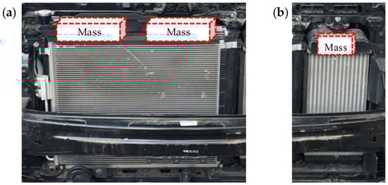 Schematics of added masses to analyze the effect of radiator or intercooler mass on vibration level: (a) the radiator and (b) the intercooler.