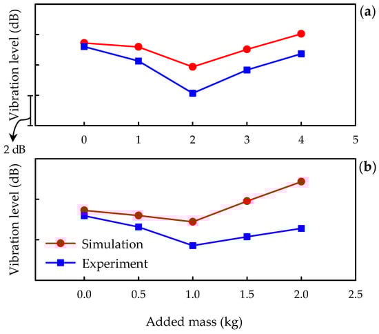 Comparison of vibration levels between the simulation and experiment obtained by changing the amount of added mass: (a) the radiator and (b) the intercooler.