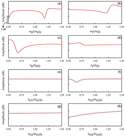 Idle vibration levels for the variations of the eight design variables: (a) radiator mass; (b) intercooler mass; (c) rubber bushing stiffness of the radiator; (d) rubber bushing stiffness of the intercooler; (e) upper hose stiffness of the radiator; (f) lower hose stiffness of the radiator; (g) upper hose stiffness of the intercooler; and (h) lower hose stiffness of the intercooler.