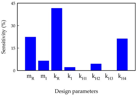 After the evaluation of the idle vibration levels for each of 117 experiments using the orthogonal array table, the effect of each design variable on the idle vibration was analyzed through analysis of variance (ANOVA) []. ANOVA is a widely used statistical formula for comparing variances across the means (or average) of different variables. The sensitivity analysis results of the design variables with respect to the idle vibration within the specified design ranges are illustrated in Figure 20. The following design variables that affect idle vibration are listed in decreasing order of sensitivity: the rubber bushing stiffness of the radiator, the radiator mass, the lower hose stiffness of the intercooler, the intercooler mass, the lower hose stiffness of the radiator, the rubber bushing stiffness of the intercooler, the upper hose stiffness of the intercooler, and the upper hose stiffness of the radiator. In particular, the sensitivity analysis results depicted in Figure 20 are consistent with those of the parametric study presented in Figure 19.