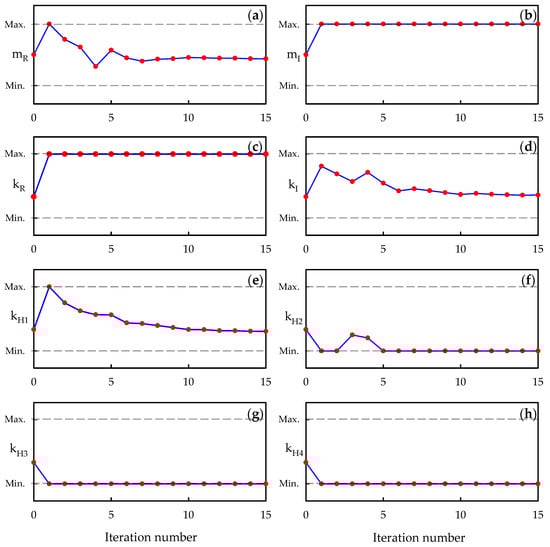 Convergence plots of the eight design variables in the design optimization: (a) radiator mass; (b) intercooler mass; (c) rubber bushing stiffness of the radiator; (d) rubber bushing stiffness of the intercooler; (e) upper hose stiffness of the radiator; (f) lower hose stiffness of the radiator; (g) upper hose stiffness of the intercooler; and (h) lower hose stiffness of the intercooler.