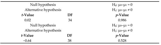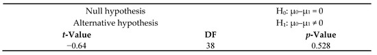 The gender t-test shown in Figure 11, the null hypothesis of the analysis is 0, while the alternative hypothesis is not equal to 0. The t-value of the Null hypothesis is 0.02, having a degree of freedom of 34. In comparison, the t-value of the alternative hypothesis is −0.64, with a DF value of 38.