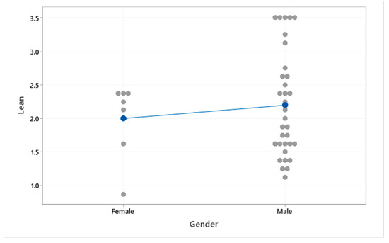 Referring to Figure 12; both cases of Agile and Lean, respectively, the p-value of the t-test is higher (p-0.986, p-0.528 > 0.05) than 0.05, which states that samples are typically distributed, and there is a difference or variance between the population mean. This signifies that the opinions of males and females regarding the effectiveness of Agile and Lean approaches are the same. Since it is statistically insignificant, the value indicates that our postulated null hypothesis is true since the t-tests are not low enough to reject it, i.e., 0.528 and 0.986.