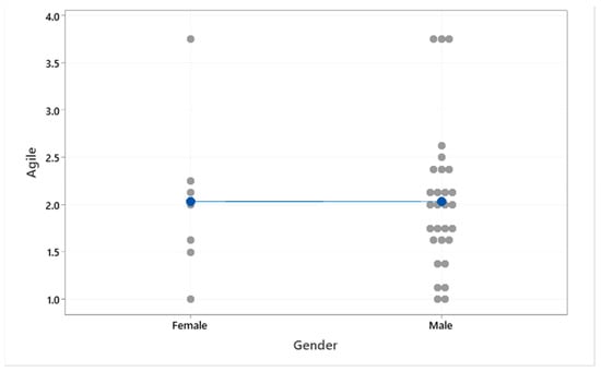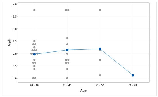 In the case of Agile, it can be stated that the p-value is higher, that is 0.986, and this indicates that the samples are typically distributed; there is a slight difference between the variables. The opinions of all age groups are similar regarding the agile approach.