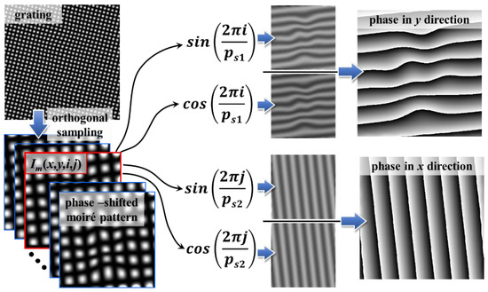 where is the x-direction phase of the moiré pattern and is the y-direction phase of the moiré pattern. According to Equation (3), the processing process and results of the orthogonal sampling moiré method are shown in Figure 2.