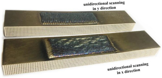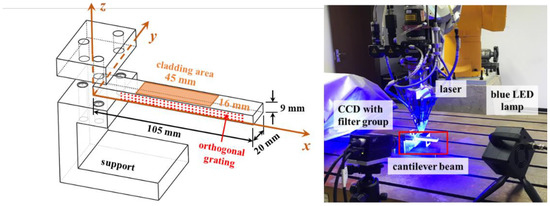 In this paper, laser repair is carried out on the upper surface of a stainless-steel cantilever beam, as shown in Figure 3 [17,18]. The laser wavelength is 1064 nm with a fixed power of 1100 W, and the beam diameter is 2–3 mm. During the repair process, nickel base alloy powder is introduced into the molten pool and finally forms a cladding layer. In order to realize deformation measurement, the high temperature resistant orthogonal grating is etched on the side of the cantilever beam by laser milling with the technique in Reference [19]. During laser repair, the substrate deforms together with the grating, images of which are recorded by a CCD camera at all times. Finally, the displacement fields in two directions are calculated with the orthogonal sampling moiré method based on the grating images.