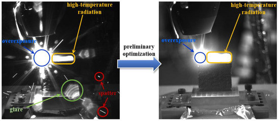 As shown in Figure 4, if the traditional image acquisition method is adopted, then the CCD camera is used to take photos directly during the repair process and the image obtained is inferior, with the influencing factors of imaging quality including overexposure, high-temperature radiation, glare and splashing powder. By shortening the exposure time, changing to a smaller aperture and adjusting the position of lens, the interference caused by glare and splashing powder can be removed. However, the overexposure of the laser area and the high-temperature radiation still interfere with the imaging quality.