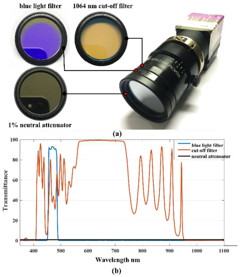Referring to the combination of blue light illumination and blue light narrow-band filter used in high-temperature deformation measurements [21,22], two high-power blue LED lamps were used for illumination and a group of filter components for laser repair environment was designed. As shown in Figure 5, the filter group was composed of neutral attenuator, a narrow-band blue light filter and a 1064 nm cut-off filter, wherein a 1% neutral attenuator uniformly reduces the light intensity of all bands to 1%. The blue light filter only allows the light in the blue light band to pass through, and the 1064 nm cut-off filter rejects light above 950 nm.