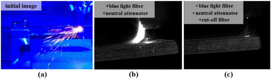 Among the three filters, a 1% neutral attenuator can solve the problem of overexposure effectively; the blue light filter can filter out most of the interference light and only allow the light reflected by the grating, which is illuminated by the blue LED, to pass through; and the 1064 nm cut-off filter can reject laser light with wavelengths of 1064 nm. The effects of different filter combinations are shown in Figure 6. It is found in Figure 6b that, without the cut-off filter, the intensity of laser light is strong, resulting in overexposure around the molten pool. Thus, it is necessary to add a cut-off filter for the laser wavelength (1064 nm) to prevent the light in this band. In addition, it is found that, in some cases, the light is reflected between the three filters, resulting in ghosting. Through testing, the problem can be eliminated by slight rotation of the filters.