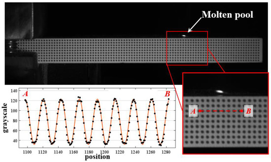 The deformed grating pattern recorded in the repair process is shown in Figure 7. It can be seen that the gray scale of the image is uniform and that the interferences of laser repair environment has been suppressed. It should be noted that, although the grating has a binary color distribution physically, its gray scale distribution is close to sinusoidal curve by moving CCD to acquire defocus images [23]. Part of the grating pattern (line segment AB in Figure 7) is intercepted and the sinusoidal function is fitted according to its gray distribution, which is . From the fitting results, it can be seen that the gray value of the image in line segment AB coincides well with the sinusoidal curve, proving that, under the prepared orthogonal grating and imaging system, the gray level of grating image presents sinusoidal distribution, which can meet the needs of online measurements of laser repair.