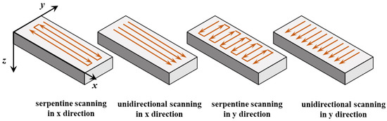 During laser repair, laser power, spot size and scanning speed affect the laser fluence input into the substrate. In addition, factors such as scanning path affect the thermal history in the process of repair and further result in different deformation and stress distribution [25]. In this paper, the impacts of scanning path and speed are studied; as shown in Figure 8, three scanning speeds of 5 mm/s, 10 mm/s and 15 mm/s are set for the four scanning paths. The width of a single cladding channel is about 3 mm, and the spacing between each cladding channel is 2 mm.