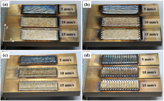 Cladding results under different scanning paths and scanning speeds. (a) Unidirectional scanning in x direction, (b)serpentine scanning in x direction, (c) unidirectional scanning in y direction, (d) serpentine scanning in y direction.