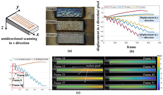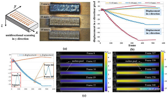 Under the unidirectional scanning path in the x direction, the cladding results are shown in Figure 15a. Compared with the unidirectional scanning results in the y direction, on the one hand, the unidirectional scanning in the x direction also shows that, when the scanning speed decreases, the displacement of the cantilever beam tends to be larger. On the other hand, the displacement under the unidirectional scanning in the x-direction is smaller than the result of the unidirectional scanning in the y-direction, but in a single cycle, the displacement in the z-direction changes more widely. From the results in Figure 15c, when the laser acts on the surface of the component, the cantilever beam is displaced downward. During the cooling stage, the displacement direction of the cantilever beam turns upward.