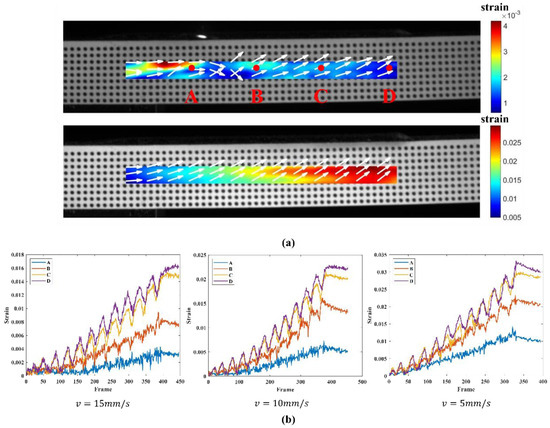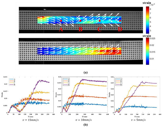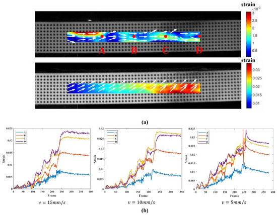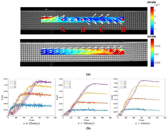 The distribution of equivalent strain and the main direction of strain at the beginning and end of repair are calculated, as shown in Figure 12a. It can be found that a concentration of strain exists around the molten pool during repair; after repair, the residual deformation presents the form of upward bending. Select four points A, B, C and D along the length of the cantilever beam, and draw the variation curve of the equivalent strain of these four points with time, as shown in Figure 12b. It can be found that the slower the printing speed is, the greater the deformation becomes; in the initial stage of scanning, when the cladding area gradually moves to the right, the equivalent strain of the four points increases linearly with different slopes; and when the cladding zone passes through points A, B, C and D in turn, the equivalent strain of each point reaches its maximum value in turn and remains unchanged. This is because, when scanning in the y direction, the beam is thermally expanded and the equivalent strain increases linearly at the beginning. However, once the molten pool passes through a certain point in the x direction, it will not ever return, and then, the equivalent strain at this point remains constant.