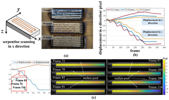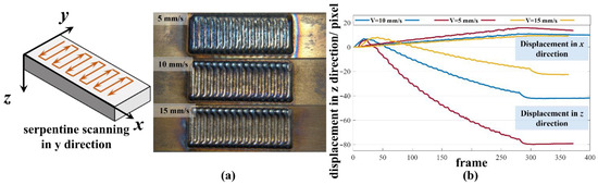 Under the unidirectional scanning path in the y direction, the cladding results corresponding to different scanning speeds are shown in Figure 11a. Set the end of the cantilever beam as the measuring point to obtain the evolution of the displacement in the x and z directions during the repair process, as shown in Figure 11b. In the image coordinates, the downward direction of z is positive and the right direction of x is positive. It can be seen that the scanning speed has a great influence on the z-direction displacement of the measuring point and that the absolute value of z-direction displacement increases along with the scanning speed decreases.
