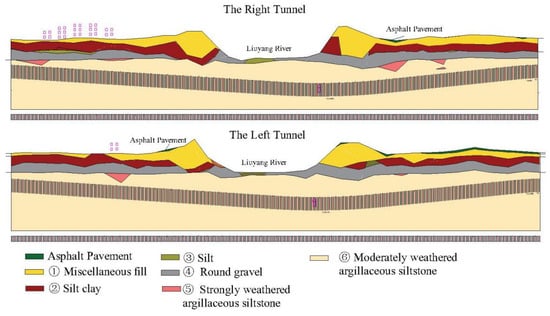 In order to investigate the detailed geological conditions of the tunnel area, the method of geological drilling was adopted in the project. According to the results of geological drilling, the rock strata can be divided into six layers, as shown in Figure 2. The ① layer (miscellaneous fill) has a thickness of 2.7–2.9 m and is mainly composed of clayey soil and weathered rock. The thickness of the ② layer (silt clay) is 4.3–4.4 m; it is wet, and as the depth increases, it changes into silt. The ③ layer (silt) is 2.1–2.2 m thick, with particle sizes greater than 2 mm. The ④ layer (round gravel) has a thickness of 2.0–2.6 m, with particle sizes of 0.2–2.0 cm. The ⑤ layer (strongly weathered argillaceous siltstone) has an obvious weathering metamorphism, with particle sizes of 2–10 cm. In the horizontal direction, this layer is sporadically distributed in the site of this section, and the distribution regularity is not obvious, with an average thickness of 1.71 m. The ⑥ layer (moderately weathered argillaceous siltstone) has a silty structure, medium-thick layered structure and argillaceous cementation, with an average thickness of 17.97 m. The twin tunnels mainly pass through moderately weathered argillaceous siltstone, and a few pass through strongly weathered argillaceous siltstone.