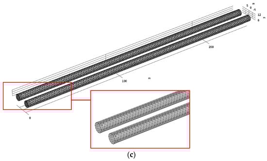 COMSOL Multiphysics analysis was conducted to investigate the tunneling-induced effect on the settlement of the overlying embankment. To simplify the calculation, each stratum was considered homogeneous and isotropic in this paper. It was assumed that the damage of moderately weathered argillaceous siltstone follows the Hoek–Brown criterion [28] and the other strata follow the Mohr–Coulomb criterion [29]. The friction angle was greater than 22 degrees, and the Mohr–Coulomb yield criterion was well adapted and accurate, so it was used to model the mechanical behavior of the soil. Meanwhile, the seepage field was assumed to satisfy Darcy’s law [30,31] because the pressure gradient of groundwater flow was not large, and the coupling condition was assumed to satisfy the Biot–Willis law [32,33]. A numerical model dimension of 80 m (length) × 200 m (width) × 30 m (height) was used to simulate the shield tunneling process, and the radius of the two tunnels was 3.1 m. The mesh and the whole 3D model used in the simulations are depicted in Figure 3. The mesh parameters of this model were maximum size 10 m, minimum size 0.6 m, maximum growth rate of adjacent cells 1.5, curvature factor 0.6 and thin domain resolution 0.02.