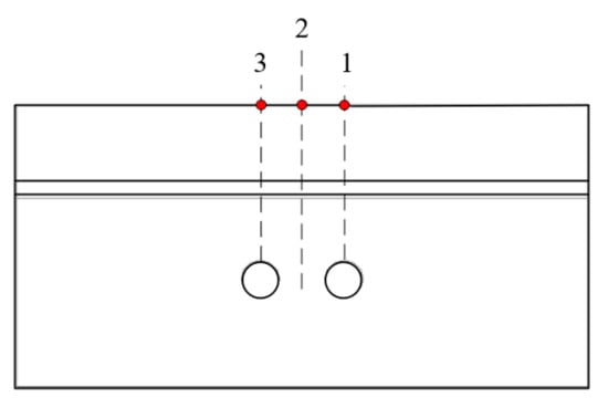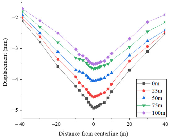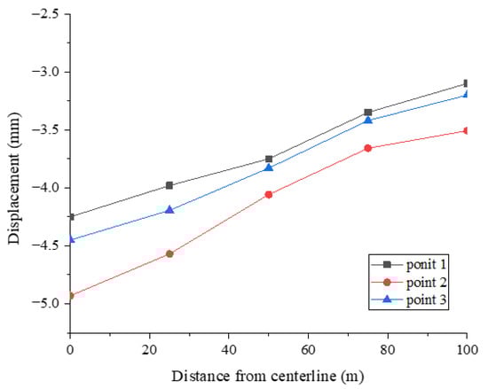 Figure 6 shows the three surface monitoring points set at the position of 10 m depth in the excavation direction, which is numbered and presented in the figure. Figure 7 shows the variation curve of the displacement at different monitoring points with the spacing of the tunnel excavation surface. From Figure 7, we can see that the larger the spacing of the excavation surface, the smaller the ground settlement value, and the maximum settlement values of 4.93 mm, 4.57 mm, 4.058 mm, 3.658 mm and 3.508 mm corresponding to 0 m, 25 m, 50 m, 75 m and 100 m spacing of the tunnel excavation surface, respectively, and the maximum settlement point occurs at the centerline of the tunnel. According to the above settlement law, it can be concluded that in the excavation stage of the right cavern first, the excavation load is mainly borne by the surrounding rock of the right cavern, and after the excavation of the left cavern, the load is shared by the left and right caverns, and the settlement trough is biased in the direction of the right cavern.