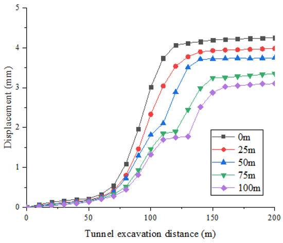 Figure 8 shows the effect of different progress differences on the variation in displacement at monitoring point 1. Monitoring point 1 is located at the location of the right tunnel under the embankment. The two tunnels cross the dike at the same time when the spacing between the tunnel excavation faces is 0. The displacement curve at the monitoring point is steeper, indicating that the displacement rate of the overlying rock layer is large when the double tunnels are dug simultaneously. The displacement tends to stabilize when the tunnel palm surface crosses the embankment. When the tunnel excavation surface spacing is 25 m, the displacement curve of monitoring point 1 during excavation is still continuously rising. However, it can be found that the slope of the rising section decreases more than before at this time, indicating that the displacement rate of the overlying rock layer decreases as the excavation progress difference increases during the expansion of the double tunneling progress difference from 0 to 25 m. When the tunnel excavation surface spacing is 50 m, the displacement increases with the increase in excavation distance, and the curve appears to slow down at the stage when the tunnel excavation distance reaches near 100 m and then continues to grow again. This indicates that the influence area of the palm faces of the two tunnels has started to separate when the distance between the tunnel excavation faces is 50 m. The curve already shows a more obvious step surface at 75 m distance from the tunnel excavation, which means that the influence area of the palm surface of the two tunnels has been roughly separated at 75 m difference in the progress of excavation. At a distance of 100 m, the curve is similar to that at 75 m, but the step surface is more obvious. At this point, the palm face of the later tunnel is already located outside the influence area of the palm face of the first tunnel, and the influence on ground settlement is similar to that of the two tunnels excavated separately. It can be seen that the further the spacing between the two tunnels before and after excavation, the smaller the amount of ground settlement and the impact on the surrounding soil. Therefore, synchronous excavation with a spacing of 100 m between the two tunnels can be chosen for this project in order to reasonably shorten the construction period.
