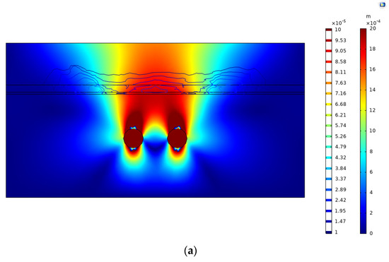 - In the third step, the “activation” function was used to simulate tunnel excavation. The numerical simulation took into account four factors: the tunnel excavation surface spacing, the tunnel depth, the tunnel spacing and the water level on the riverbed side. The tunnel boring process is in the x-direction of the model (see Figure 3a) and is simulated using a stepwise excavation method with a step length of 10 m. The newly excavated part of prestressing is zero, and the remaining part of prestressing is the stress field after excavation stability in the previous step.