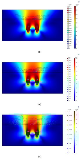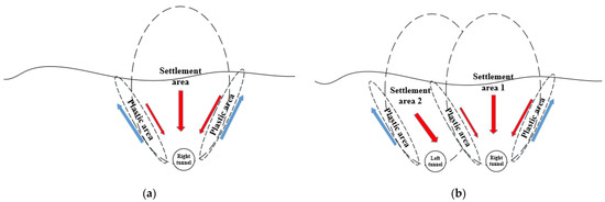 After the excavation of the right line tunnel, a settlement area and plastic areas are formed above the tunnel as shown in Figure 10a. Shear areas occur between the settlement area and the surrounding unsettled area due to the incompatibility of displacements, and the plastic strain in the overlying soil layer occurs mainly in this area. When the left line passes through the tunnel, the part of the settlement area formed by the left line and the settlement zone formed by the right line overlap because the settlement has already occurred, so the shear area formed after the excavation of the left line mainly occurs on the left side of the left settlement ellipse, which is further expanded on top of the plastic strain area formed by the right line as seen from the plastic strain contour map. Moreover, the plastic area generated by the surrounding soil of the first tunnel is larger than that of the later tunnel because the stresses in the surrounding rock are released after the excavation of the first tunnel.
