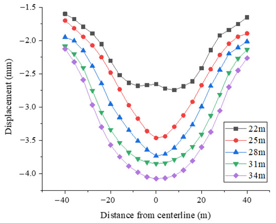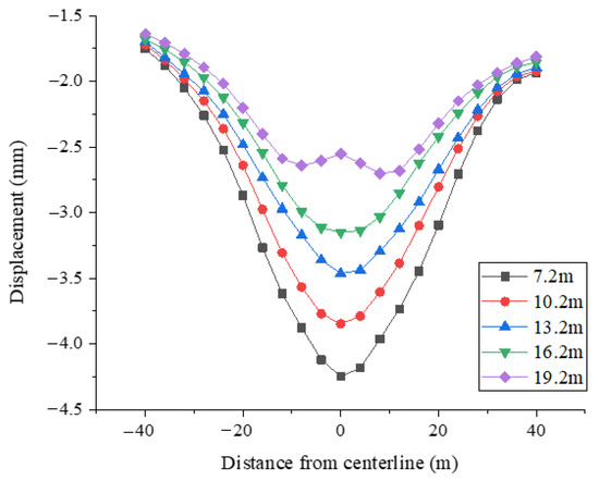 Figure 11 shows that the ground settlement curve changes from a W-shaped curve to a V-shaped curve, and the maximum value of the ground settlement is shifted from the surface above the right hole vault to the vertical centerline. At the same time, the ground settlement value increases with the increase in burial depth, as shown in Figure 12. When the burial depth of the tunnel increases, the maximum settlement values of the ground surface are 2.745 mm, 3.508 mm, 3.735 mm, 3.851 mm and 4.084 mm. The maximum sedimentation value increased by 27.80%, 6.47%, 3.11% and 6.05%. As the tunnel depth increases from 22 m to 25 m, the ground settlement value increases significantly, but when the tunnel depth is 28 m, 31 m and 34 m, the maximum ground settlement value is closer, and the sensitivity of ground settlement to the tunnel depth decreases. This is due to the fact that when the tunnel depth reaches a certain level, a soil arch will form. The soil arch effect is formed when the tunnel depth reaches a certain level and can mitigate the ground settlement effect.