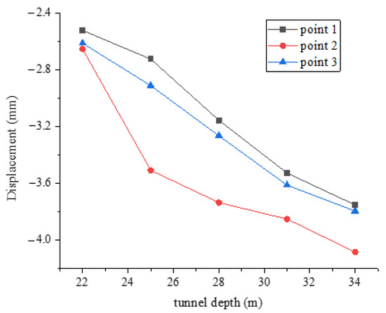 Variation curve of displacement at different monitoring points with the tunnel depth.