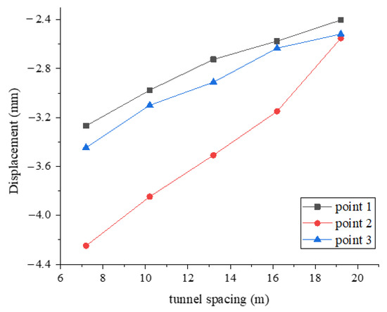 Variation curve of displacement at different monitoring points with the tunnel spacing.