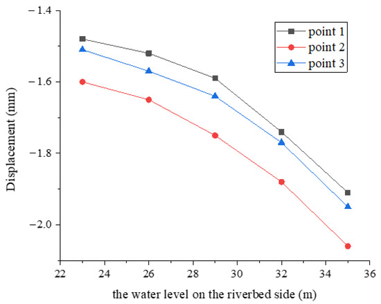 Variation curve of displacement at different monitoring points with the water level on the riverbed side.