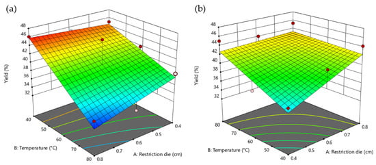 Response surface plot showing the effect of temperature and restriction die size on yield of CSO. (a) Sieve size: >1.4 mm, (b) Sieve size: <1.4 mm.