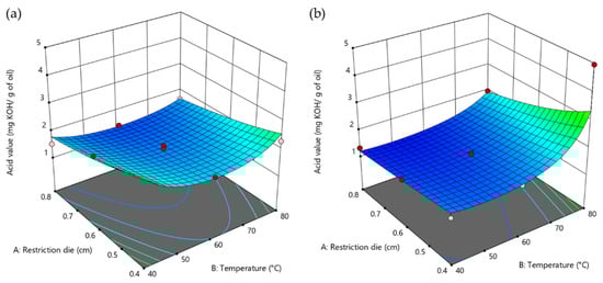 The reduced quadratic model equation was statistically significant for acid value prediction. Sieve size significantly affected the acid value. The correlation between extraction temperature and the acid value was positive, which indicates that the quality of the CSO depends on the extraction temperature. The acid values of CSO were also influenced by restriction die size (Figure 2).