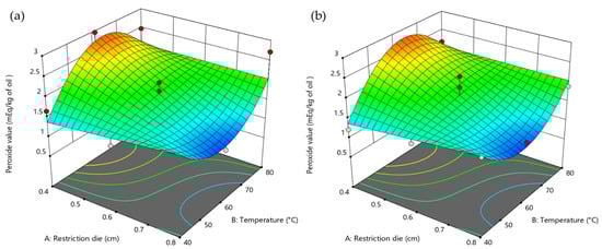Response surface plot showing the effect of temperature and restriction die size on the peroxide value of CSO. (a) Sieve size: >1.4 mm, (b) Sieve size: <1.4 mm. Sieve size had no influence on the peroxide value of the CSO.