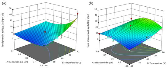 The temperature (p = 0.0001), sieve size (p = 0.0078), restriction die and temperature (p = 0.0363), restriction die and sieve size (p = 0.0428), and the restriction die2 and sieve size (p = 0.007) significantly influenced the total phenolic content for CSO extraction (Table 4).