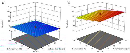 Response surface plot showing the effect of temperature and restriction die size on pressing time to extract the CSO. (a) Sieve size: >1.4 mm, (b) Sieve size: <1.4 mm.
