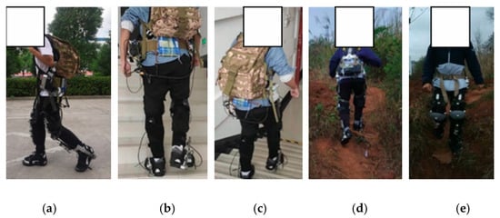 A total of five subjects volunteered to participate in this experiment, and the height of these subjects was 1.60~1.80 m and the weight was 60~80 kg. Before the experiment, all participants were informed of all experimental procedures and had no diseases. Before the experiment, the connection between each structural member and the exoskeleton’s information acquisition system was checked to ensure that the sensor is calibrated and in a standard state. When a subject is wearing an exoskeleton, the length of the exoskeleton rod is adjusted based on the subject’s feelings. Then the subjects walked adaptively for approximately one minute, after which they continued to fine-tune their gait to maximize human comfort and flexibility. Each subject wore an exoskeleton robot and conducted two types of experiments at a speed that was approximately constant and without load. The initial experiment consists of a stable mode experiment with various locomotion modes. As shown in