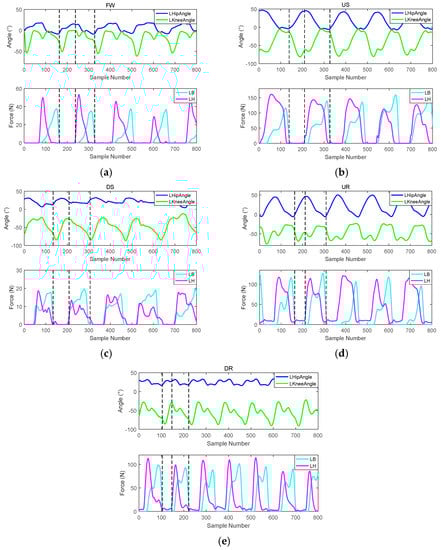 Figure 3 depicts the joint angle and plantar pressure for each of the five locomotion modes.