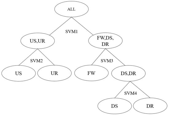 Table 1, both OVO and DAG use a one to one approach for basic SVM training. The number of SVM sub-classifiers that must be trained is the greatest and grows exponentially as the number of K classes increases. The basic thought of OVR and HSVM is one to rest, and the number of trainers is significantly less than OVO and DAG. HSVM employs a tree structure to reduce the complexity of training and requires the training of only (K–1) SVM classifiers. OVO and OVR must traverse all trained SVMs, resulting in low overall efficiency. DAG adopts directed acyclic graph structure, and the average number of SVMs required for classification is (K–1), with a small number and high classification efficiency. Although HSVM traverses all sub-classifiers, classification efficiency is also high due to the small number of trained classifiers. To sum up, it is very clear that HSVM requires the smallest number of sub-classifiers during training and identification due to its unique tree structure, and this method has the least amount of training calculation and the highest classification efficiency. Therefore, HSVM is used to classify and identify locomotion modes in this paper. The overall structure of HSVM is comparable to that of binary tree, in which the intermediate node implements local decisions and the leaf node identifies the category. This method makes full use of a priori human behavior. In order to ensure the validity of the classification, it makes the categories within the subclasses more similar while the categories between the subclasses have clear distinctions. For HSVM to have the best generalization performance, the divisibility between the upper layer’s two subclasses must be as strong as possible [