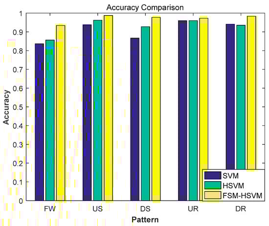 The experimental results show that the average recognition accuracy of FSM-HSVM for five different motion modes is 97.106% ± 0.955%, whereas the average recognition accuracies of SVM and HSVM algorithms are 90.826% ± 2.391% and 92.807% ± 1.927% respectively. In comparison with the other two algorithms, the average recognition rate increased by 6.28% and 5.036%, while the standard error decreased by 1.43% and 0.972%. Evidently, the algorithm proposed in this paper demonstrates superior recognition efficiency and recognition stability compared to SVM and HSVM. However, the results also show that the recognition accuracy of the three kinds of flat walking is the lowest, and there is a high likelihood that they are misidentified as walking down the ramp. The shortest distance, according to the DTW distance table, is between the FW and DR. It demonstrates conclusively that the similarity between the two modes is high and difficult to distinguish. This is likely due to the slope selected in this paper being only about 10°, making it virtually identical to the flat ground. At present, some good progress has been made in recognition accuracy in motion pattern recognition [