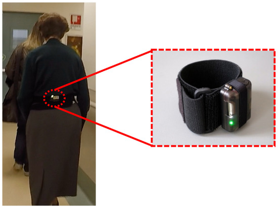 The used inertial wearable sensor and its position on the subject’s lower back.