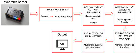 In [8], the authors showed that conventional measures in a laboratory environment do not reflect the daily-living activities of PD patients. In fact, daily-living measures provide important information that is not captured in a conventional one-time laboratory assessment of gait, balance or the Unified Parkinson’s Disease Rating Scale (MDS-UPDRS). With the advanced growth in technologies, the use of wearable sensors for an objective long-term monitoring of PD patients in the home scenario can play an important role [9,10]. The wearable sensors are better suited to quantify gait in unsupervised and free-living environments, such as in a home scenario, providing a more comprehensive overview of the continuous walking monitoring. Several validation studies in controlled settings exist, but only a few of them have examined the validity of wearable and associated algorithms in uncontrolled environments [11]. Various works have focused on the detection of tremor episodes in constrained and unsupervised environments [12,13,14], on the PD turning analysis in patients suffering from freezing [15] and fall risk [16,17], and on the detection of on/off states [18]. Other works have carried out a walking analysis in laboratory and home scenarios, providing gait quantity (i.e., number of steps and number of walking bouts) or gait quality (i.e., step length (m), step regularity, and the amplitude of dominant frequency) [8,19,20,21,22]. Furthermore, in the literature, walking activity is not always correctly detected during free living [8,20] and therefore it is necessary to develop reliable algorithms able to correctly identify walks and distinguish them from non-walking activities. Conversely, other recent papers have analyzed walking only in clinical environments, obtaining only time domain parameters [23,24,25]. Recent studies propose wearable sensor networks that are able to monitor the level of activity and the motor fluctuations of a PD subject during the day [26,27]. However, the use of a single inertial measurement unit able to provide a complete analysis of quantity and quality gait in time and frequency domains has not yet been studied.