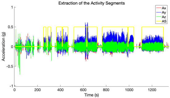 where i is the current sliding window, N is the total number of sliding windows, , , and denote accelerations along x, y, and z axes in time domain, and fft is the fast Fourier transform. If the SMA and EN values of the current sliding window exceed the 75% of the mean of the SMA and EN, respectively, for at least three consecutive windows, activity is considered to have occurred. Conversely, values below the threshold mean the user is in a resting state. Subsequently, only activity with a duration higher than 10 s was used for further processing. Figure 3 shows the output of this step of the algorithm.