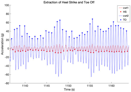 where the is the center frequency of the wavelet. The local maxima of the latter signal are the detected TO events. Figure 4 shows an example of step detection from a walking segment where HS and TO events are identified.